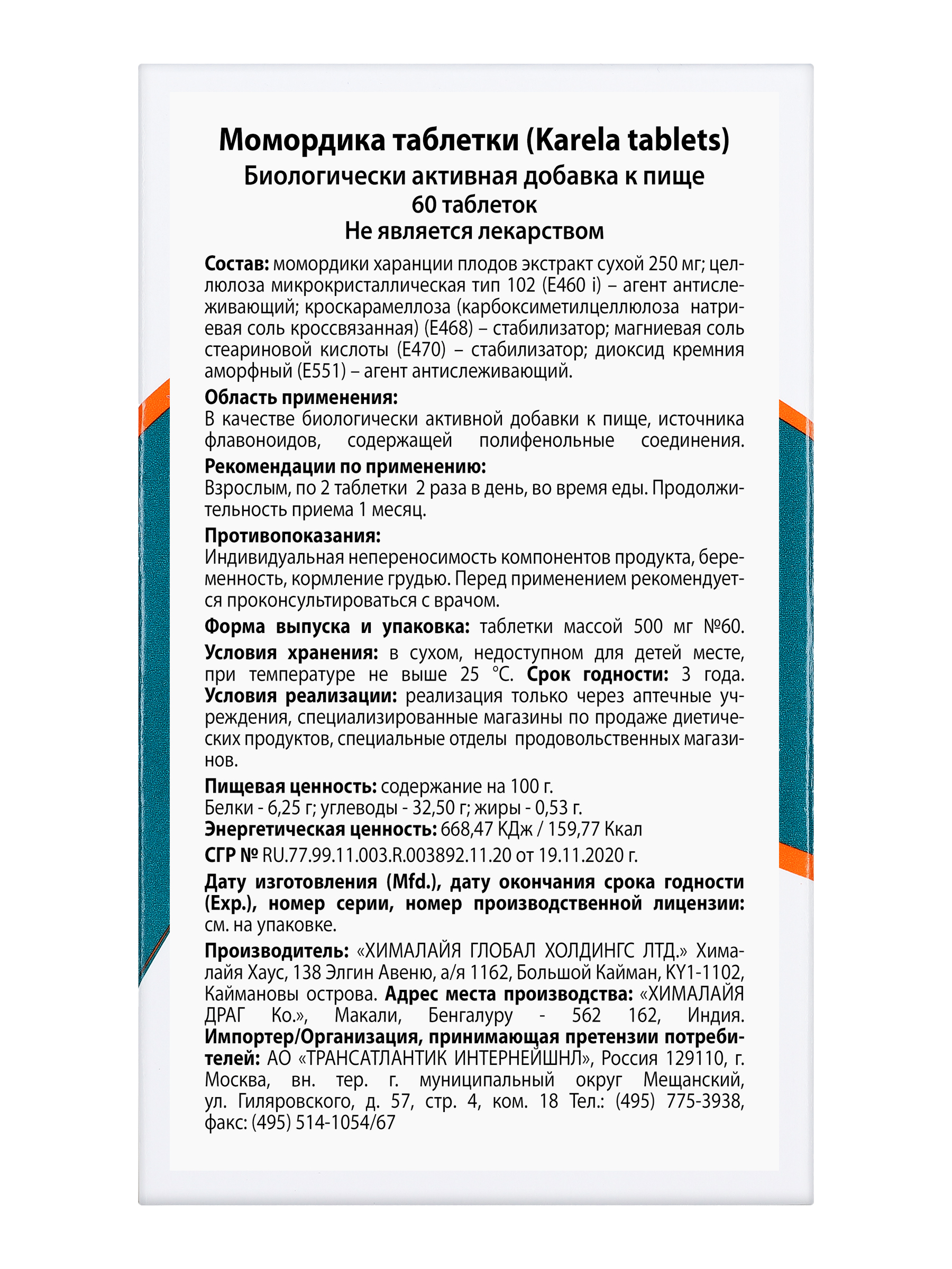 Активные компоненты:Момордики харанции плодов экстракт сухой 250 мг